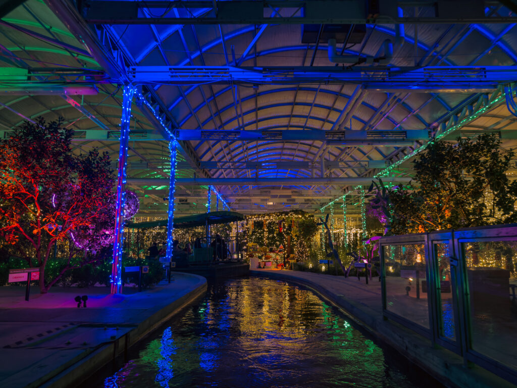 Glimmering Greenhouses retains the same core ride but adds a holiday overlay to the greenhouse scenes. Disney’s own description is straightforward: a special, sparkling boat tour with festive visions of twinkling holiday lights while you cruise through the greenhouses.