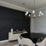 Adding personality to the space was essential, and Eric the Hare wall mount did just that. This whimsical piece brings a touch of playfulness to the otherwise sophisticated and dark decor, creating a balanced and inviting environment. I also repurposed an old painting frame with a canvas print of a family portrait for some wall art.